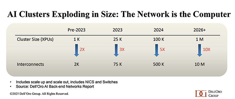 As the chart illustrates, AI clusters are rapidly scaling from hundreds of thousands of GPUs to millions of GPUs. Over the next five years, the expectation is that there will be about 124 gigawatts of capacity to be brought online, or an equivalent of more than 70 million GPUs to be deployed. In this reality, the network will play a key role in connecting those GPUs in the most optimized, efficient way. The network is the computer for AI clusters.