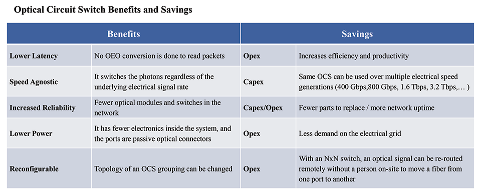 A major advantage of OCS is that it is fundamentally speed-agnostic—because it operates entirely in the optical domain, it does not need to be upgraded each time the industry transitions from 400 Gbps to 800 Gbps to 1.6 Tbps or beyond. This stands in stark contrast to traditional electrical switching layers, which require constant refreshes as link speeds accelerate. OCS also eliminates the need for optical-electrical-optical (O-E-O) conversion, enabling pure optical forwarding, that not only reduces latency but also dramatically lowers power consumption by avoiding the energy cost of repeatedly converting photons to electrons and back again.