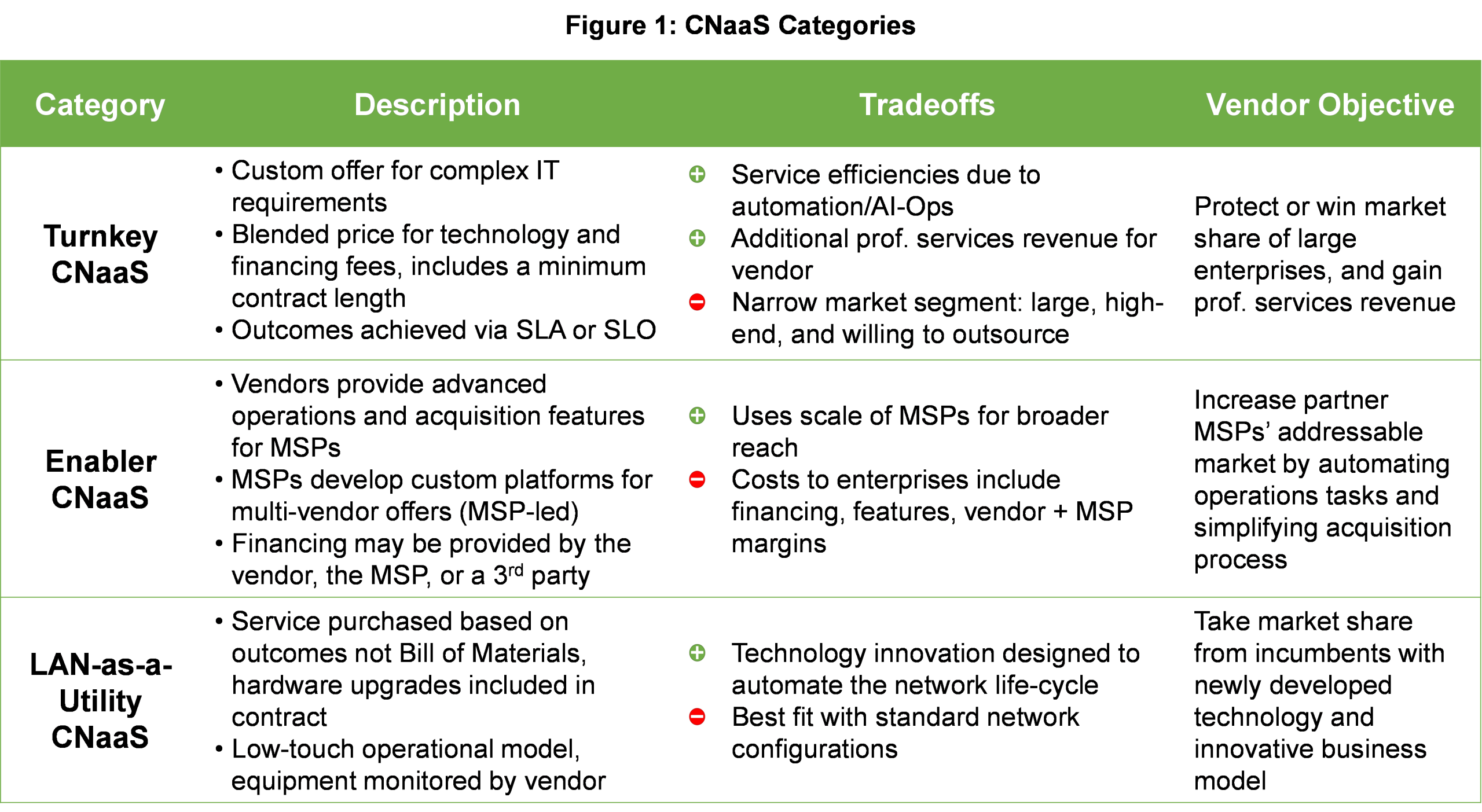 - Market examples: This category of CNaaS is made up mainly of incumbent LAN equipment vendors leveraging existing MSP relationships.