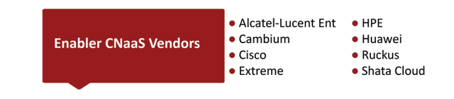- Who offers it: Enabler CNaaS is typically offered by incumbent LAN equipment vendors that maintain deep channel relationships with MSPs. Unlike Turnkey CNaaS, the vendor keeps the vendor–MSP partnership intact. Exceptionally, Shasta Cloud is a startup in this category. Shasta leverages TIP’s OpenLAN initiative and requires a service provider or partner to label and deliver the offer to customers.