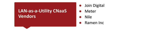 - Who offers it: Whereas the innovation of Turnkey and Enabler CNaaS offers is centered on the business model and acquisition process, LAN-as-a-Utility vendors have developed entirely new hardware and software designed to automate network delivery and operations.