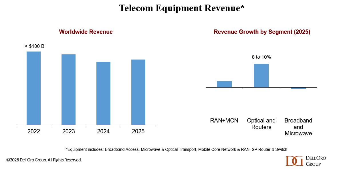 Following the 14% revenue decline between 2022 and 2024, telecom equipment investment conditions improved in 2025. Preliminary findings indicate that aggregate worldwide telecom equipment revenues across the six programs tracked by Dell’Oro Group—Broadband Access, Microwave & Optical Transport, Mobile Core Network (MCN), Radio Access Network (RAN), and Service Provider Router & Switch—increased 4% year over year (Y/Y) in 2025, supported by an exceptionally strong fourth quarter (accounting for 29% of full-year revenue).
