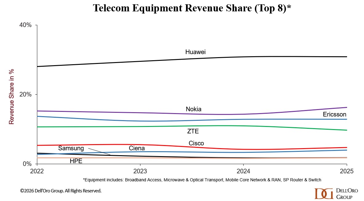 Global supplier rankings remained largely unchanged, although revenue shares shifted modestly. Nokia gained share, while Huawei and Ericsson remained broadly stable. Nokia’s share gains were partly driven by its acquisition of Infinera.