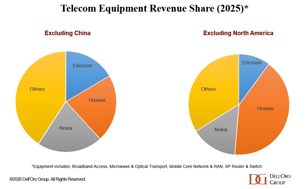 Regional dynamics vary significantly. Excluding China, the revenue distribution among the top three suppliers is more balanced. In contrast, excluding North America, Huawei’s overall revenue share reached a new high of 41% in 2025.