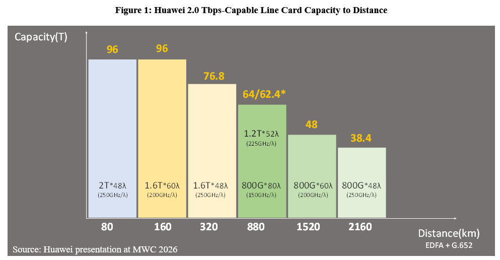 How does Huawei’s new coherent wavelength technology compare to the rest of the industry? We did a simple comparison between the industry and Huawei (Figure 2). Specifically, we looked at high-performance coherent muxponders that are generally available as of 1Q 2026. Of course, this doesn’t give a deep assessment of Huawei’s technology or even that of the industry. But at a high level, we think it gives a good sense of where the company is at.